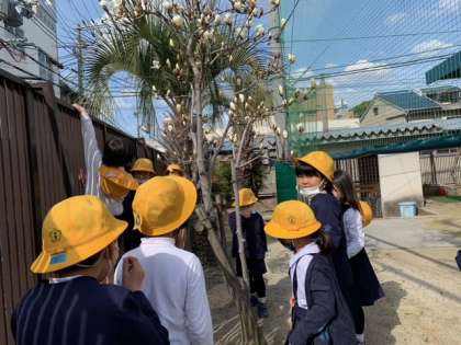 と、冬の校庭探検の際に見つけたモクレンが咲いていることも発見しました。