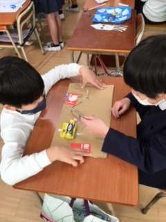 理科の学習で学んだ磁石や電気、ゴム、音などのそれぞれの性質を利用して作ったおもちゃです。学んだことを活かすだけでなく、楽しく遊べるように工夫されたおもちゃがたくさんありました。
