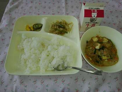 <牛乳 ごはん マーボーどうふ きゅうりとコーンの甘酢和え もやしとピーマンのごまいため>