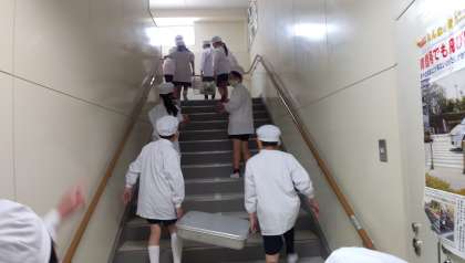 給食当番は重い食缶をゆっくりゆっくり慎重に運びました。