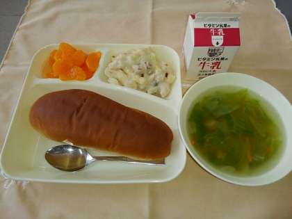 <牛乳 黒糖パン マカロニグラタン レタスのスープ みかん(缶)>