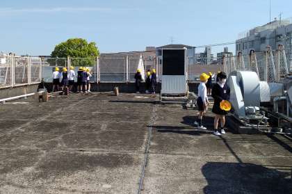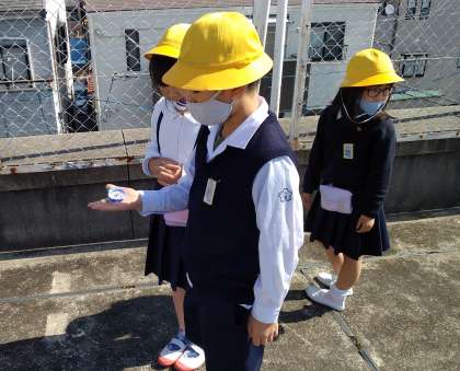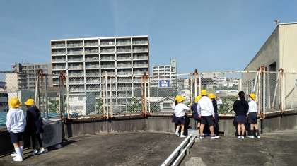 「わたしたちのまちみんなのまち」の学習で、学校の屋上から町の様子を観察しました。