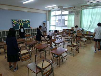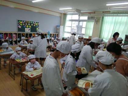 1年生の給食当番、教室の掃除は6年生がお手伝いをしてくれています。