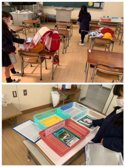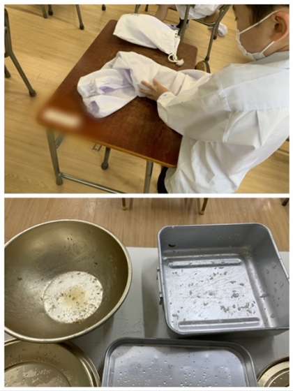 給食エプロンは、しっかりたたんで片付けています。給食もたくさん食べていて、食缶が空になるメニューも増えてきました!
