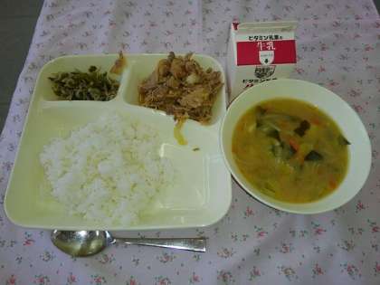 <牛乳 ごはん 豚肉のしょうが焼き みそ汁 じゃこピーマン>