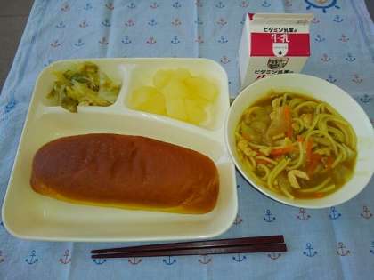 <牛乳 パンプキンパン カレースープスパゲッティ キャベツのピクルス りんご(カット缶)>
