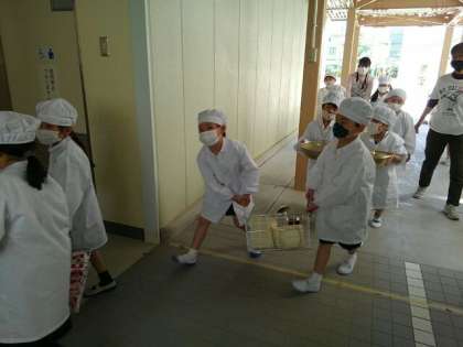 1年生は、今日から自分たちで給食を教室まで運び、配膳もしています。