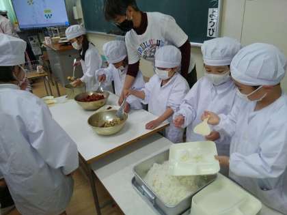ごはんやおかずをみんな同じように配るのは、ちょっと難しいです。