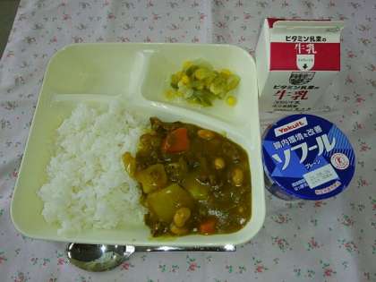 <牛乳 牛肉と大豆のカレーライス レタスとコーンのサラダ ヨーグルト>