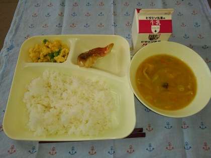 <牛乳 ごはん あかうおのしょうゆだれかけ みそ汁 えんどうの卵とじ>