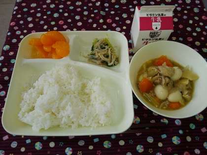 <牛乳 ごはん 八宝菜 チンゲンサイともやしのしょうがあえ みかん(缶)>