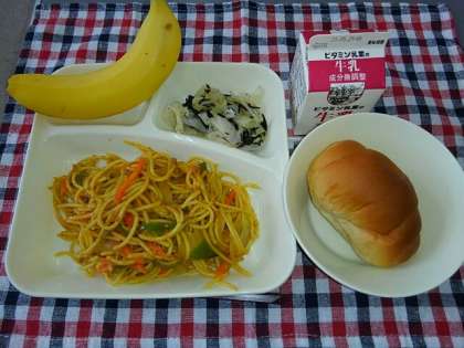 <牛乳 1/2パン カレースパゲッティ キャベツのひじきドレッシング バナナ>