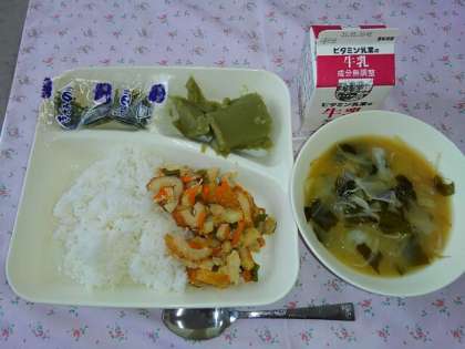 <牛乳 かやくご飯 みそ汁 まっ茶ういろう>