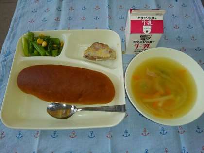 <牛乳 黒糖パン かつおのガーリックマヨネーズ焼き ベーコンと野菜のスープ グリーンアスパラガスのソテー>