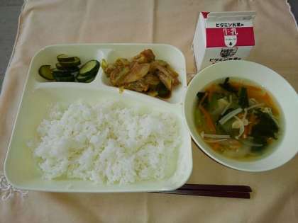 <牛乳 ごはん ホイコウロー 中華スープ きゅうりのピリ辛あえ>