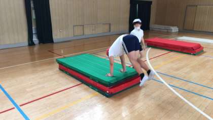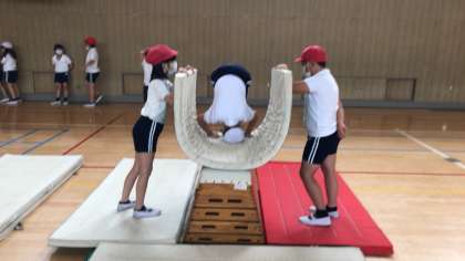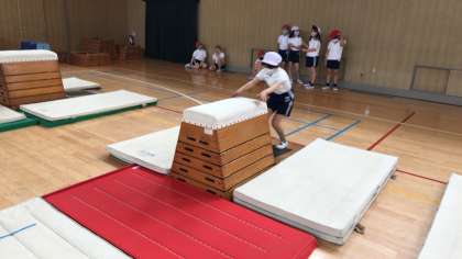 頭がつく場所を確認してから、重ねたマット、低いとび箱、4段、というように徐々にレベルを上げていきました。