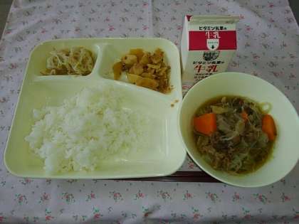 <牛乳 ごはん 肉じゃが もやしのゆずの香あえ ごまかかいため>