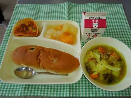 <牛乳 レーズンパン 豚肉と野菜のカレースープ煮 変わりピザ ミックスフルーツ(缶)>