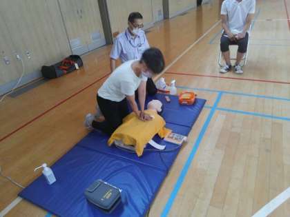 胸骨圧迫(心臓マッサージ)とAEDの使い方を実技で確認しました。