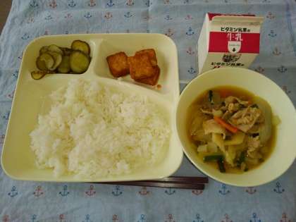 <牛乳 ごはん 中華煮 あつあげのピリ辛じょうゆかけ きゅうりの中華あえ>