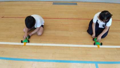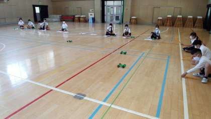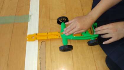 ほとんどの子が、ゴムをのばす長さが長いほど車が進むきょりが長くなりました。ゴムがはずれたり、発射台が斜めになったりしてうまく実験できなかった子もいましたが、最後に、ゴムを長くのばすほど、ものを動かすはたらきは大きくなるというまとめをすることができました。