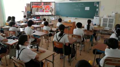 児童朝会では、双方向通信の遠隔による平和学習を行いました。