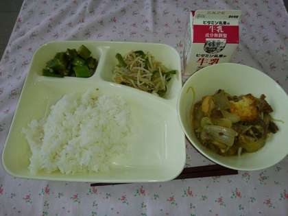 <牛乳 ごはん すき焼き煮 オクラのかつお梅風味 もやしとピーマンのごまいため>