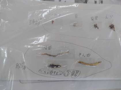 虫メガネで煮干しを観察した後、つまようじを使って脳や背骨、心臓や胃腸などを取り出して紙にはりました。
