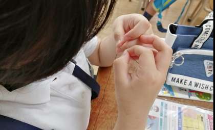 新しく購入した裁縫セットを使って、手ぬいの学習が始まりました。