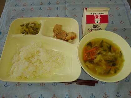 <牛乳 ごはん 鶏肉のしょうゆマヨネーズ焼き 五目汁 切り干しだいこんのゆずの香あえ>