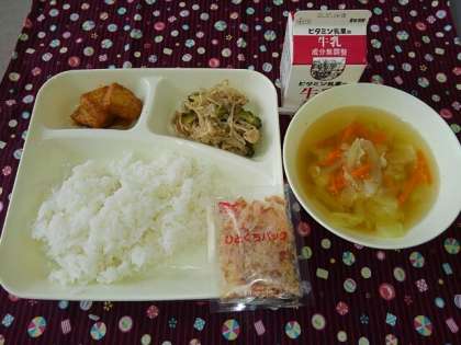 <牛乳 ごはん ゴーヤチャンプルー すまし汁 あつあげのしょうがじょうゆかけ>