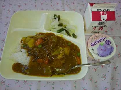 <牛乳 ビーフカレーライス(米粉) 野菜のピクルス ぶどうゼリー>