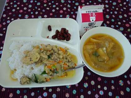 <牛乳 他人丼 とうがんのみそ汁 金時豆の煮もの>