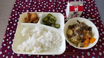 <牛乳 ごはん 肉じゃが あつあげのみそだれかけ あっさりきゅうり>