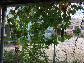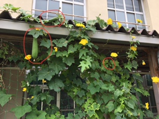 運動場側から見ると屋根に載っている実があり、驚きました。種を取って春に植えた種と比べてみたいです。