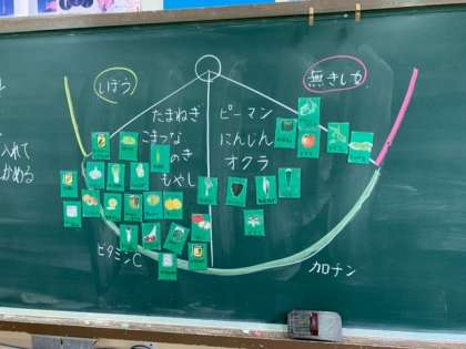 毎日の献立に使われている材料を、栄養素毎に分けてボードに貼って知らせています。