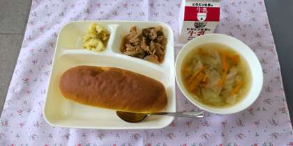 <牛乳 パンプキンパン 豚肉と野菜のケチャップソテー スープ スイートポテト>