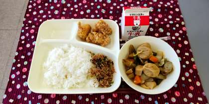 <牛乳 ごはん 鶏肉のたつたあげ 一口がんもと野菜の煮もの おかかなっ葉>
