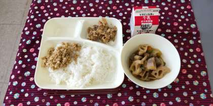 <牛乳 ごはん 豚肉のねぎじょうゆかけ ふきよせ煮 ツナ大豆そぼろ>