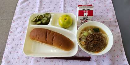 <牛乳 黒糖パン タンタンめん きゅうりの甘酢づけ みかん>