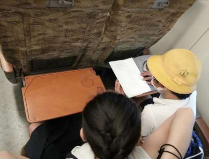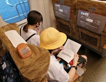 車内ではしおりを見たり、平和セレモニーの練習をしたりと、それぞれが考え、行動しています。