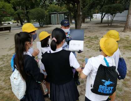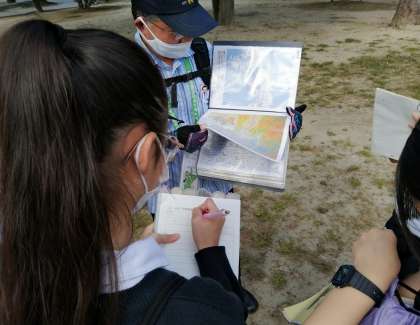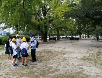 写真を見ながら、広島の特性と戦争による被害の説明を聞いています。