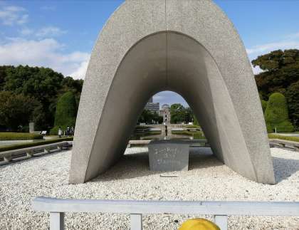慰霊碑からは、ちょうど原爆ドームが覗けます。