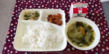 <牛乳 ごはん まぐろのオーロラ煮 すまし汁 もやしとピーマンのいためもの>