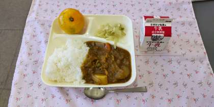 <牛乳 ポークカレーライス(米粉) キャベツのピクルス みかん>