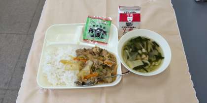 <牛乳 ピリ辛丼 中華スープ ソフト黒豆>