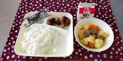 <牛乳 ごはん みそカツ じゃがいもと野菜の煮物 焼きのり>