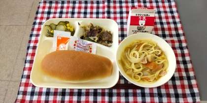 <牛乳 コッペパン 牛肉のカレー風味焼き ほたて貝とトマトのスープスパゲッティ きゅうりとコーンのサラダ(ノンエッグドレッシング) いちごジャム>