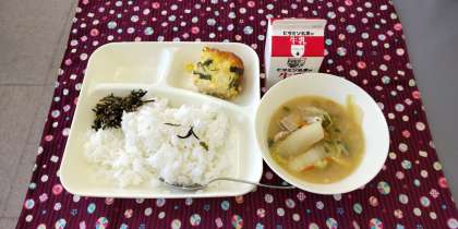 <牛乳 ごはん 千草焼き みそ汁 ごまひじき>
