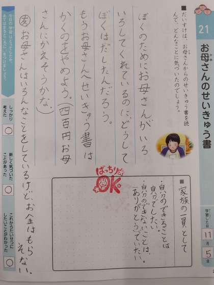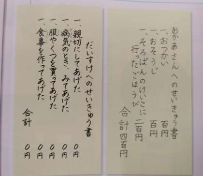 「お母さんのせいきゅう書」で、ぼくとお母さんがそれぞれどんな気持ちで請求書を書いていたかを想像し、家族で協力し合うことの大切さを学びました。
